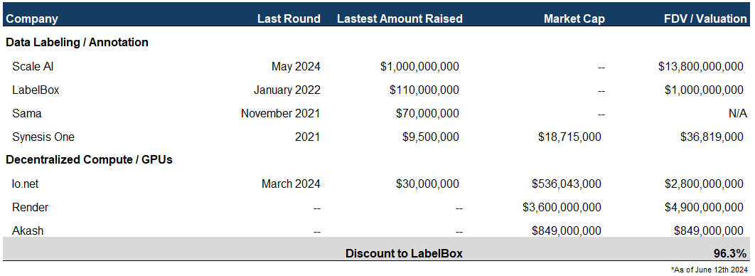On the other hand, there aren’t many pure-play data companies, and a massive valuation gap exists between Synesis One (~$34 million FDV) and web2 comparables like Scale AI ($14 billion valuation), LabelBox (~$1 billion valuation), among others. In the crypto space, Grass has yet to launch, but its launch could serve as another catch-up play catalyst, depending on its initial valuation. Decentralized GPU / DePin plays trade in the multibillion dollar valuation range despite a handful of these projects with limited differentiation and uncertain demand.